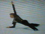 Trophy Lalique was not the most competitive event of the season. On the ladies side, Maria Butyrskaya won over Viktoria Volchkova and Jennifer Kirk. Butyrskaya was not perfect technically, but with the scores received by her closest competitors, she really didn't need to be. Volchkova suffered from a problem that always seems to plague her; although she started out great with a huge triple Lutz/double toe loop combo, but faded more and more as the program progressed. Jennifer Kirk, the young World Junior Champion, made a great senior debut, with a bronze medal. She did complete a triple toe/triple toe combo, but this didn't seem to raise her technical marks. Although Peter Caruthers seemed to think that she should have beaten Butyrskaya, I disagree. She hasn't developed a presence on the ice yet, although I do think that, based on her triple/triple, she should have been placed in second, above Volchkova. Although we didn't see the pairs competition, apparently Bereznaya and Sikuredlitze won over Selle and Pelltier. In dance, Anissina and Peizerat won the competition. I wasn't pulled into their music this time as much as last year's program, but that one was hard to top :-) The real highlight of the day came with the men. To be more specific, one of the men: Alexei Yagudin. Although Yagudin didn't have much more competition than Butyrskaya, he would have still beaten even the best in the world with his performance here. Comparing Yagudin with his closest competitors here was a laugh: there simply was no comparison. Stanick Jeanette (France, 2nd place) and Roman Serov (Russia, 3rd place) had little presence on the ice. Although you have to give Serov credit for trying a quadruple loop, which no one has done before, he doubled it. Frankly, I doubt Serov would have caught Yagudin even if his attempt had been successful (though he may have won the silver instead of the bronze). Yagudin keeps getting better and better every time we see him skate this program. His only minor flaws were a shaky landing on the triple in his quad toe/triple toe combination and popping what was supposed to be a triple loop in a triple flip/triple loop combination. But you know what? Who cares. Yagudin got all 5.8's and 5.9's for technical merit, and 5.9's and three 6.0's for presentation. But it was the way he skated it that was so eye-catching. Yagudin expressed his music with so much feeling and his presence on the ice was so strong that it made the other skaters look like amateurs. He used his spins very effectively, as always, with good positioning and a lot of variety. One move that caught the eyes of the commentators was a new move that has never been seen before: a very unusual and difficult slide, in which Yagudin supported his weight on one arm and slid down the ice on the sides of his boots (without the blades touching the ice). Here's a picture of it (sorry it's a bit fuzzy, but you get the gist of the move):