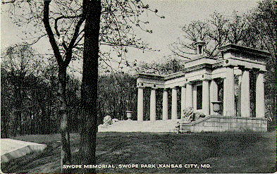 The mausoleum was constructed in 1917. Though accessible by foot paths and a road, the Swope Memorial, high among the trees on the bluff just east of the Lagoon, is seldom visited by the thousands of kine visitors who go to the park each year. The road is blocked off at night by the Park Rangers, allowing normal access only by footpath. No Gangrel is permitted to access the road with a vehicle, or abandon the vehicle at the road block when coming to the Memorial. Go by foot, or wing ... or not at all. |