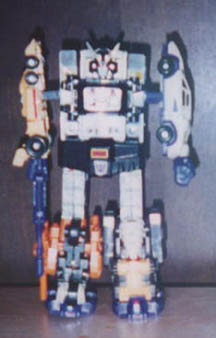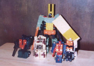 The team five consists of three Stunticons; Dragstrip, Wildride, and Motormaster and...(beleive it or not) two Compubots... Yup. This bootleg combiner team, is a mix of three Decepticons and two Autobots. Yet; they do all fit together pretty well and I think, (for a bootleg) it's a pretty good toy.