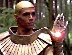 In this episode Daniel is attempting heroism, he stands guard, outside the room where Jack and the other's are trying to launch an offensive, with TWO weapons! But if evreything went according to plan and there was no danny-whumping, it just wouldn't be SG1. So Daniel get mortally wounded. And practically orders Jack to leave with out him! Luckily this 'irrepressible spirit' of his also comes into play and he painfully crawls towrds something. We later see him emerge from a sarcophagus(part two in the Danny/Goa'uld thingy which brings back the dead relationship). He then uses his alternate universe knowledge to use the Stargate to take him to the alpha site (beta site in AU). By the way they couldn't use the gate in the first place because they need to be in orbit around a planet to have a point of origin. He didn't just gate to earth because that wouldn't have been ingenous enough. Oh and also he didn't have the GDO code to open the iris. Oh and Earth was the point of origin so can't be the destination to. Oh and...you get the point right? Of course the possible best part of this death was the reunion he got with SG1. You know what I mean the now classic "Space Monkey" scene! |