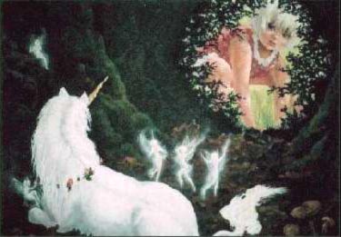 | To me, the Secret Land of the Unicorns is a lot like faeryland, perhaps even a part of it. It is as far away or as close as your imagination makes it. The only way to find it is to Believe and to remember that it may not appear to you the way you expect it to. I saw faeries in my head and drew or painted them long before I was able to see them with my open eyes. I must admit that I don't think I've even seen a unicorn with my eyes open. | ![]() |