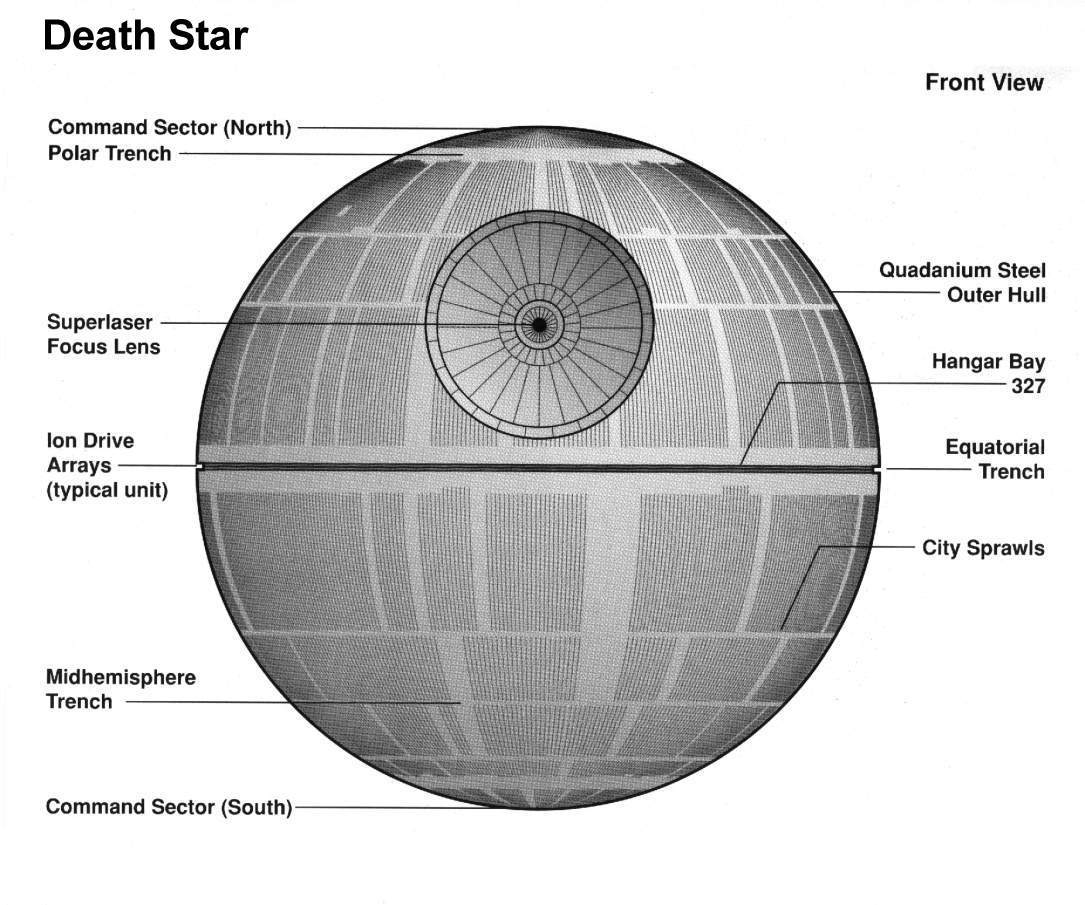 Everything about the Death Star boggles the imagination. At 120 kilometers in diameter, it was the size of a Class IV moon and was the largest starship ever built (at least until the construction of the larger second Death Star). Fully half of the battle station's interior was filled by the reactor core, the sublight and hyperdrive systems, and the superlaser housing.