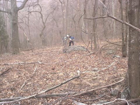 Once you get to the site and are all ready, you follow the handler and dog as they procede on the task, taking care not to get between the handler and the dog or between the dog and the scent. You read the map as you go along the top of a hill, and monitor the radio. Then, you get a call from another team.