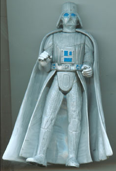 I had had the idea for a good guy Vader figure, but this one looks a little better. Still, you'd think Vader would make his helmet look a little less fierce. I was going to white-wash a normal Vader figure, but decided to use a Silver Edition one instead. Not only does it make it somewhat unique, but I didn't have to use as many coats to cover the silver as I would've had to use ot cover the black. The blue for his buttons and eyes is a bit more vibrant that my scan shows, and I decided not to trim his lower cape, since I think that's an art mistake.