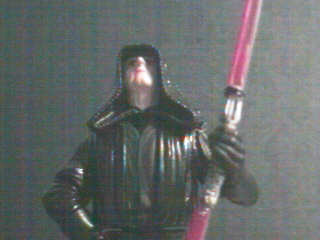 In the Darth Maul Journal Darth Maul mentions dueling with his master. Using my extra Maul body and Sidious head I made what might as well be it. Dueling in his heavy robes doesnt seem all that right, and since he's raised Maul I'd assume they'd wear simliar clothing to duel in. I guess he'd keep the hood just in case he got an emergency call or something. For his saber I took the extra half of Maul's I had and added my spare red blade onto the other end. I figured that since Sidious was the master, he'd have to be better at saber fighting than Maul was (ponder that for a moment won't you) and so only needed the bare minimum of a handle. Wow, that was a lot to say to convince myself of this figure's validity wasn't it...:)
