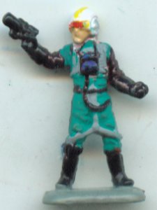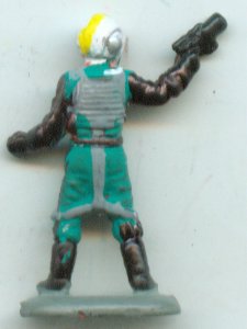 I must say, I truely love this custom. Getting the detailing this small was a bit fo a pain, but I think it's well worth it. At first I tried to get him to be dark green, but it blended in with the black too much so I changed it. The bright green actually makes it look more like the rest of Galoob's Expanded Universe line anyway, since a lot fo those figures were done in neon colors.