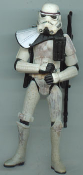 Yes, we already have a white pauldroned Sandtrooper (I try not to do customs of figures already made - no matter how badly they get screwed up) but I figured I could set the record straight on which trooper Davin is. A lot of people think he had an orange pauldron, when as you can see from the ref pic, it was white. He was also named as the trooper in the cantina, which most people assoiate with having an orange pauldron, but there are actually two who come in - one with orange, the other with white. Besides the white pauldron I also toned down the sand on the costume, raised the black band over his eyes (since it was just a stuck on piece of rubber, it was placed too high on a lot of Stormtroopers) and gave him the droid part in his right hand (look closely and you'll see it) which was made from the link of the old lave Leia's chain. Lastly I gave him the long rifle the COMMTech Stormie comes with, since he has that in the Cantina. It fits in a crease in his backpack (as does the Stormy rifle he comes with - look for a retangular hole in the bar on the right of the backpack)