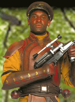Made from a Panaka head and Naboo Soldier body and hat, this figure borders the line between Expanded Universe and being in the film. First I was just gonna make a black Naboo Soldier, but then they released the Wizard of the Coast game, and it had a Black Guard named Galak. Theres not much of a difference between the two, and I'd rather my figures have full names so Galak it is.
