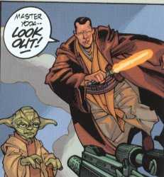 I wasn't really sure what to name this guy. He's not named, maybe he'll show up in some other comic. I finally took apart my Darth Sidious in Training Gear figure, which I was never ever happy with. I used a Darth Maul body instead of a Jedi body because of the longer skirt that the figure needs. This Jedi goes to attack the Yincorri, but Yoda just used the force to knock him down again. Warrior seemed appropriate enough as a name. Oh yeah, it's a Wedge head in case you were curious.