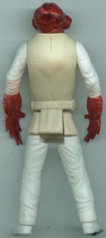 In Isard's Revenge Wedge meets Captain Jhemiti, a red Mon Calamari. Well I finally had an insperation to change my Mon Cal Crewmember, and so I did. The cool thing was the green marker I used for his tiger stripes absorbed into the plastic so now he still has skin detail! See - use Sharpies for good skin effects. A lot fo people who've seen this custom didn't know I had done anyting to it - they assumedit was just Ackbar. I figure it's cause of the fact that the vinatge figure did have red skin, while the POTF2 one had the proper salmon skin tone.