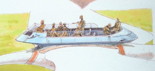I suppose I should strap this to a thranta or something, but it's a bit much for what I do. This was from a very early concept in which Jabba's Palace looked like a beehive in the grasslands, and his barge and skiffs were strapped to huge flying beasts called thrantas. Thrantas were originally thought of for Bespin, then Jabba, and then for the Gungans to use when they fought the Battle Droids. Who knows, maybe we'll see some in Episode 2 or 3.