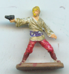 I wasn't sure what to do with yet another Micro Machine Tatooine Luke. For my Hasbro customs I was doing a Raynar from Star By Star and I figured that the Tatooine Luke outfit looks close enough to a Jedi uniform to fudge it. It's an interesting outfit I know, I'l explain it when the Hasbro figure is up (which should be soon). Oh - why is he holding a gun and not a lightsaber. For the answer click HERE.