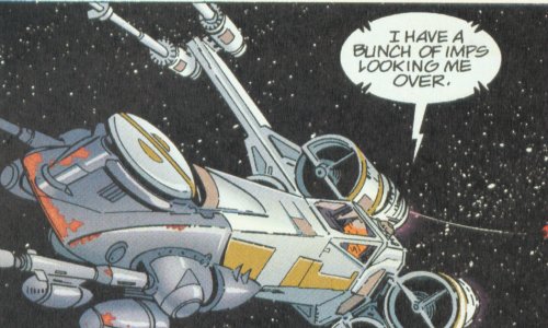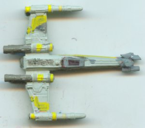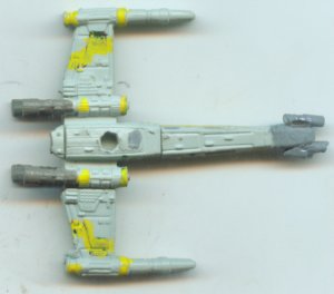 I swear, this comic lends so much to customizers! This is an X-Wing covered with sensor equipment. First I made the markings yellow (somehow I don't have a yellow X-Wing yet) and then crazy glued on some random bits to the nose. The X-Wing is also supposed ot have 2 trailing probes, but in micro scale they'd be too delicate to attempt. Besides, they can reel em in anyway.