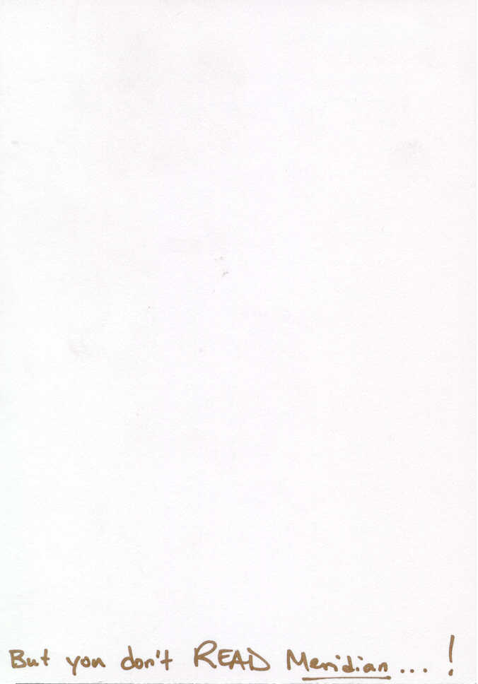 This is the back of Wraith's Sephie sketch, and it's all my fault, cos i jokingly (thought truthfully) told Beeber while Steve was working on his sketch that Wraith was having her sign his Sephie sketch as a way of making up for him not reading Meridian. Together me and Beeber convinced him that is IS a great book, and I think he succumbed... but only time will tell.