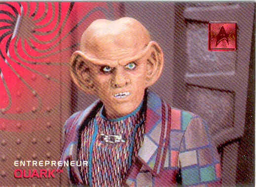 Quark and Rom are brothers. Quark, the older of the two, on your left, is the perfect Ferengi; His first and last thoughts of the day are of profit. Quark owns the tavern and holodeck concession on the promenade at DS9. He uses his roll as older brother to exploit Rom to the utmost.