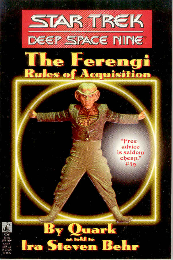 After much cajoling(we told him it would be profitable), Quark was persuaded to collaborate on the book seen here. Its' concise wording says much about the Ferengi mindset. Here are a few of my favorite entries. #1-Once you have their money.....you never give it back. #6-Never allow family to stand in the way of opportunity. #13-Anything worth doing is worth doing for money. #35-War is good for business. And the very best of all..... #285-No good deed goes unpunished.