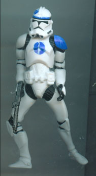 Obviously based on the first Galactic Heroes Clone Trooper from Ep3, I named him "Kashyyyk Concept" simply because he came with Chewbacca. Gree was the only "traditional" Clone Trooper seen on Kashyyyk, everyone else was a BARC Trooper. The markings went to Commander Neyo on Salucami, and other than the GH figure I have no proof if this existed in any concepts, or if Hasbro just goofed on the color. The kneeling green Clone from the 3-Pack has the same markings as the Utapau clones, and the yellow Felucia clones were once red, so it's possible that the red dots were once blue. The figure itself was made from a prone Clone from the 3-Pack. I cut and reglued the legs to make them straighter - and to my surprise he can stand on his own!