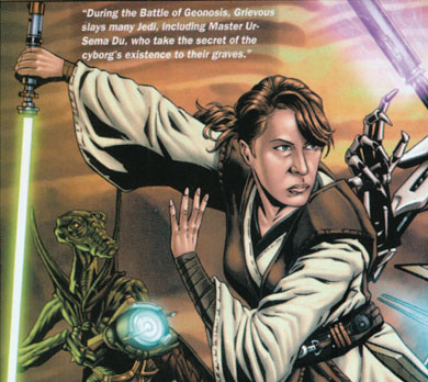 UrSema-Du is a character who hasn't actually appeared in any stories. After seeing her in Unknown Soldier, which is an article about the history of General Grevious, I realized she's based on comic artist Jan Duursema. While looking for other pics of UrSema I managed to uncover the history of the character. Apparently Joe Corroney created that character and put her in a shot with Kai Justiss for a Wizards of the Coast project. I'm not quite sure of the details next, but Jan either didn't like the idea, or didn't want a character based or her or something, and in so in an article about the Jedi who died in the Battle of Geonosis, or maybe it was a list of Jedi who Grevious killed. I can't remember which - I know I've read it, but I don't know where, or what it's called. UrSema-Du was added to the list. Character dead, case closed - right? Apparently not. While the character wasn't resurrected, a focus on Grevious's whereabout during the Battle of Geonosis mentioned that he killed UrSema, and a pic was included.
