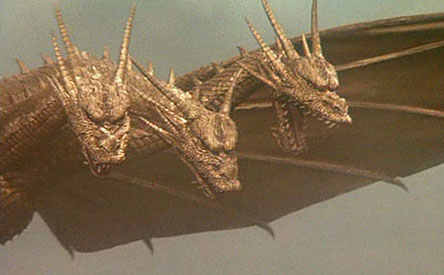 King Ghidorah is the creation of the human race from the future. They created the Dorats as pets and left them on the same island as the Godzillasaurus when it was hit with an atomic bomb. The radioactivity fused the 3 Dorats together to create King Ghidorah. The Dorats have a mind control devices that makes them perfect pets and they can sense feelings through microwaves. They also have the ability of flight for quicker movement. After they became King Ghidorah, the mind control device stuck with it and the humans from the future could also control it as they did with the Dorats. As King Ghidorah, the Dorats gained the abilities to create hurricane winds and expel powerful Gravity Beams from each of there 3 mouths. When King Ghidorah fought Godzilla, it looked like he had the upper hand until his middle head was blown off. Then he came back in a more metallic form known as Mecha King Ghidorah.