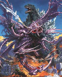 Megaguris is a giant insect from the past. She is the queen of her colony of Meganula and Meganuron. The Meganuron is the first stage of this breed of insect. Next is the Meganula which is the adult dragonfly type creature. It has a stinger on its tail used to drain energy from living things. Megaguirus was chosen by her colony to fight for them and gain territory. She started out as a regular Meganuron but was fed energy by Godzilla which was taken from him by the flying Meganula. This energy made her grow quickly. By the time she gets enough energy, she breaks out of her exoskeleton and breaches the surface of her watery home. Megaguirus can fly at up to speeds of mach 5 making her the fastest Toho kaiju to date. She also has razor sharp wings which can cut through even Godzilla's tough hide. Megaguirus can also generate a high frequency magnetic wave with her wings by causing them to vibrate at super-sonic speed. This shockwave is devastating to anything in its path and can make mechanical devises malfunction from a great distance. She can also create hurricane winds with her wings knocking over any opponent. Megaguirus has a sharp stinger at the end of her tail used for draining energy from her opponents. She can then redirect this energy into a ball and fire it at her opponent causing a great deal of damage. Megaguirus finally has claws which can grasp an opponent with great strength.