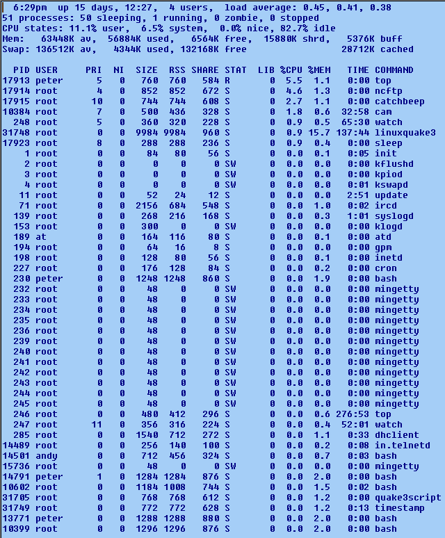 This page is going to be permanently under construction (g). I'm just starting to learn about Linux. While IMHO it can't replace Win9x, it can do many, many things better than the other guys. My server at home has been up as of this writing for 15 days, 11 hours, and 16 minutes without a reboot. Now some of you might say "so what?" Well, if you actually use Win9x to do anything I'd be surprised if you didn't reboot at least every 3-4 days for one reason or another. I decided to look into Linux because I'd heard about it's stability, low system requirements, and of course, because it's free! If you've read about me then you know that I'm self-taught and learn primarily from reading and trashing my system (g). This means that Linux is a tough row to hoe for me. I'm lucky to have such a good friend as Andy! He's been into Linux for many years and compared to me he's a genius! He's the SysAdmin for my server while I'm learning and of course I pester him with silly, basic questions all the time as well.