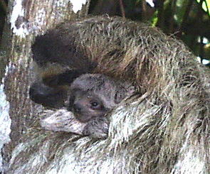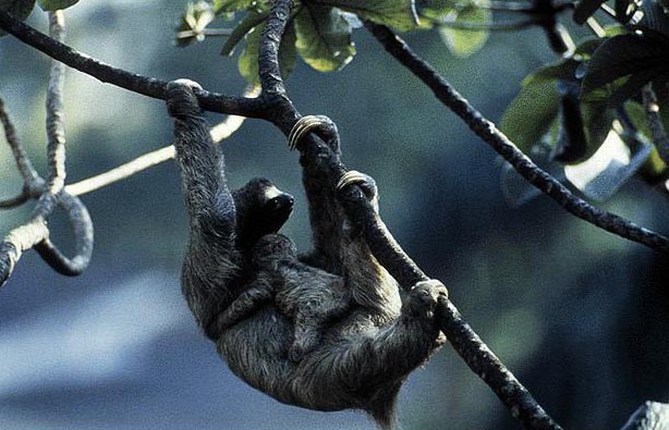 birth, the sloth hangs from a branch, the young sloth baby emerges head