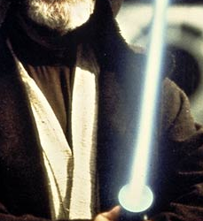 "An elegant weapon from a more civilized age."The weapon of the Jedi Knights, the lightsaber is undoubtably the most deadly short-range weapon. Upon ignition, the a beam of energy is emitted from the hilt, forming a high-intensity "blade" that will slice through anything - except another lightsaber blade. The beam is so intense that if it were to slice through living flesh, the heat would be hot enough to instantly cauterize a wound - leaving no blood. The weapon is used as a high-tech sword in combat. However, the weapon possesses great defensive quality as well, due to the fact that bolts fired from a blaster can be blocked or deflected using the blade. Because of the dangers and difficulties related to its use, a lightsaber is quite difficult to use - the main reason why it remains unique to the Jedi Knights and Sith Lords.