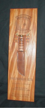 Our KA-BAR plaques are unique in that they are suspended vertically. Customer must provide the KA-BAR knife and Sheath. This particular plaque is made of 3/4" Honduran Mohogany. If there is another wood you would like to use, please contact us. Laser engraving is included in the price.