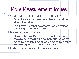 - Will see later chapters, validity of substantive conclusions made for some statistical tests assumes equal-interval measurement. Although some stats are sometimes applied to situations without strict interval properties, if approximation to interval properties is reasonable, the the substantive conclusions are not affected.