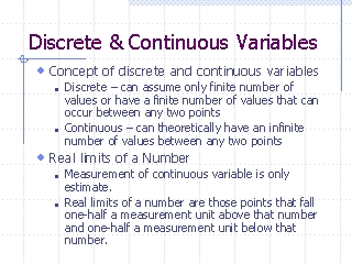 - Whether variable is classified as discrete or continuous depends on the nature of the underlying theoretical dimension and not on the scale used to measure that dimension. Tests used to measure intelligence, for example, yield scores that are whole numbers (101, 102, etc.). Nevertheless, intelligence is still continuous in nature because it involves a dimension that allows an infinite number of values to occur, even though existing measuring devices are not sensitive enough to make such fine distinctions.