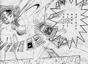 Kakyuu was hiding in the same insence burner Chibi Chibi has, as in the anime. The 3 lights found it and tried to take it from Chibi Chibi, and that's when Kakyuu appeared. Then Kakyuu guides Eternal Sailor Moon to the Galaxy Cauldron, where Galaxia is. The 3 lights get killed on the way. At the end of the journey, Kakyuu reveals that she too is a senshi, Sailor Fireball!! Sailor Chi, one of Galaxia's henchpeople, quickly killed Kakyuu by stabbing her through the back. Eternal Sailor Moon then avenged Kakyuu's death by killing Chi.