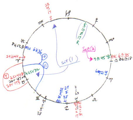 In the partial charts shown below, birth planets and their harmonics are inside the circle. Conception planets and their harmonics are outside the circle. Conception sidereal planets are red; conception harmonic ones, black. Birth sidereal planets are blue; birth harmonic ones, green. Occasionally, because of space limitations, I have had to violate this inside/outside arrangement, but the color coding remains constant.