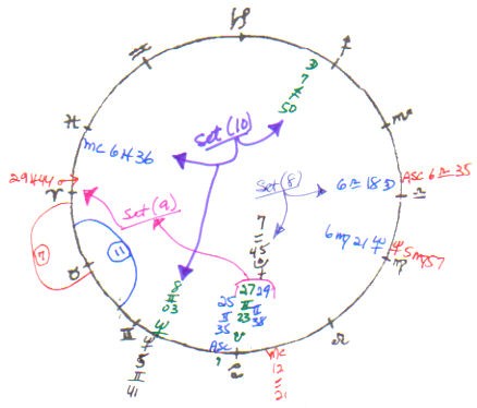 Note again the lighted mars in Pisces with Angular influence. I have left out possibly significant influences from 4th and 8th houses (as has been the case with all the sets in this paper). Right now we are only interested in the Angle/7th/11th part of the path.