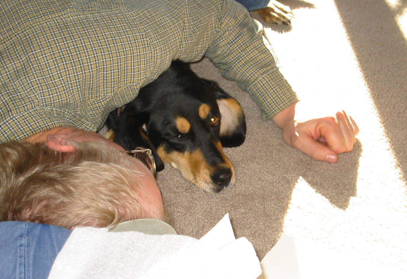 Ginger was being rowdy so dad held her down. she looks so guilty.