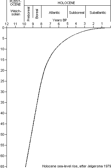Link to 'Arthurian' chronology.Perhaps the decline in sea-level rises was apparent through oral tradition. After all, with rises averaging an inch a year, distinct changes would have been evident in a single lifespan, let alone a tribe's. Is it coincidence that megalithic cultures arise 'on the turn' as it were? Or were extant structures, already lost, being recreated? Are there connections with world-wide legends of a 'deluge'? Interestingly, coastlines, around which many human societies settle, are not as stable as one may think, eg;