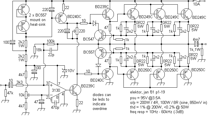 The input, drive, bias and thermal feedback arrangements differ notably from the norm. The output following a familiar and rugged pattern (output devices 125W, 100V, 40A, 200kHz, 25hFE), this form of design's dependence (and that of the suggested power supplies, below) on expensive, difficult to obtain, large value, high-voltage electrolytic capacitors led to its' falling out of favour. Apart from restricting the low frequency performance, multiplying these components increased expense and compromised reliability.