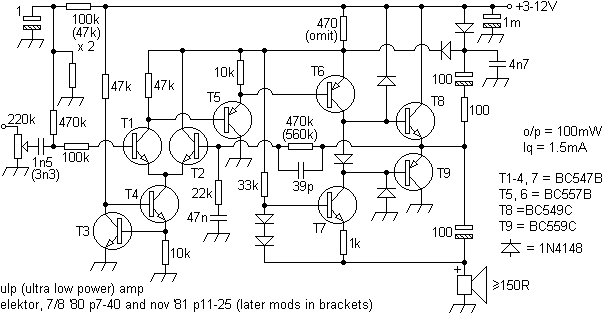 ULP (ultra low power) amplifierA self-indulgent inclusion especially for the curious. A seemingly complex design intended for mobile use that will, however, run on supplies that others could not, eg: solar.