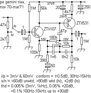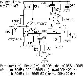 The RIAA preamp circuit improves on the bias stability and removes the subsonic ringing evident with some contemporary (and later!) two transistor designs. The mic preamp follows the same pattern.