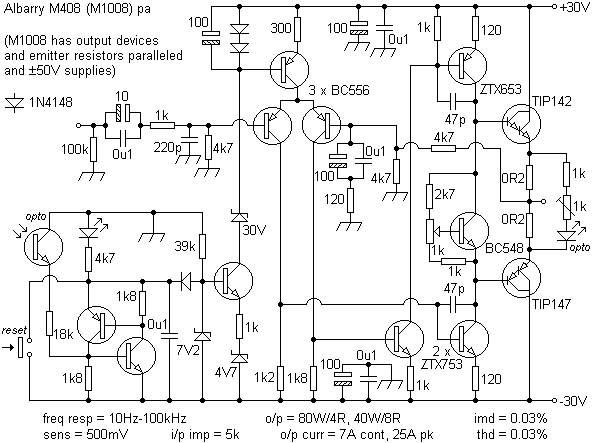 The Albarry M408/M1008 (below, courtesy of Trevor Latala) used this technique to limit the input stage, although this might have been seen as academic in the M1008 since the supply voltages were those of the Vce of the output devices with no safety margin. This detracted from a design that otherwise attracted positive comment in sonic terms.