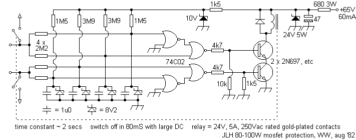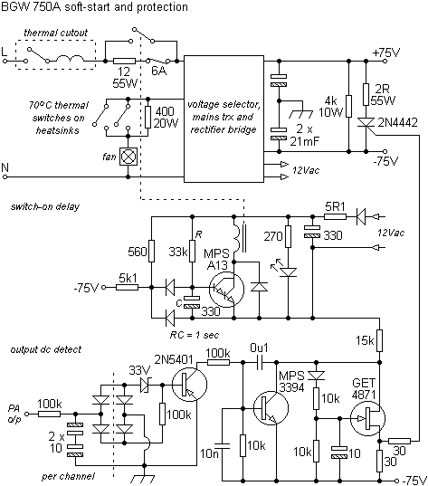 A current cut-out in the mains feed preceded a resistor that was shorted after a one second delay. The cooling fan ran at a slower rate until one of the output stages thermal switches (fitted directly to an output device) came into play then saving motor wear but also indicating inadequate ventilation. The detection of DC on the output lines would fire a thyristor across the supply dissipating the energy away from the speakers, each of which in an array would be protected by its' own fuse.Class H designs switch in a higher voltage supply to cope with peaks then helping to reduce dissipation. Most use a Darlington series pass power transistor for switching the relevant supply rail to the output devices. Each is triggered by a comparator whose inputs are fed via diodes from the output and a zener reference derived from the supply. In the event of an overvoltage appearing at the output, the comparator then cuts in the higher supply to the relevant supply rail. At the same time, a thermistor can be used to trip the circuit on an over-temperature condition.
