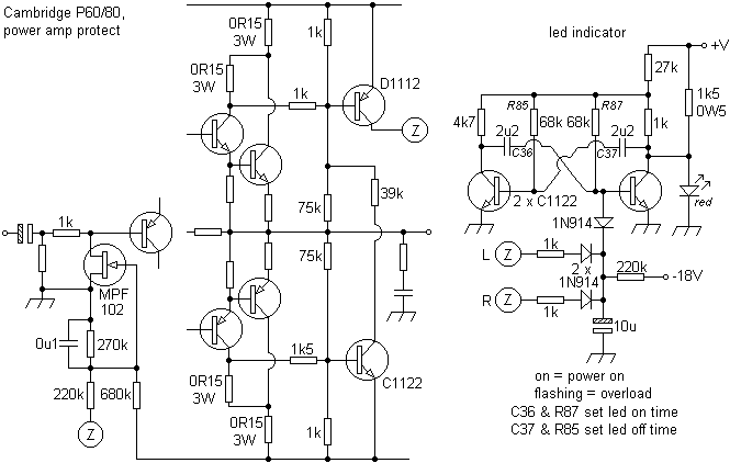 One recalls upsetting a number of 'audiophile' engineers by pointing out that the current from the overload indicator LED in the JLH Hi-Fi News 75W design (BDY56 output Trs) was dumped straight into the base circuit of the Class A driver and a perhaps better approach was to take an overload signal via an opto-isolator paralleled with the current sense resistors for the output current limiters. Apparently, to criticise a Linsley Hood design in some circles is blasphemy. However, this approach has been used to good effect, eg;