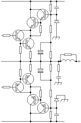 Such output stages could then become quite complex affairs, as can be seen, increasing the component count and thus the possibility of failure. Layouts like this are commonly seen in amplifiers giving outputs of 1kW or more.The mid-seventies BGW 750A (and the lesser 500D) was, with ten 2N3773 output transistors per channel, intended for rugged professional use and 'built like a tank', as some have put it. No current limiting was included in the output stage this being intended to be capable of dissipating all of the energy from the power supply.
