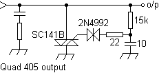 Below is the clamp fitted to the output of the 'current-dumping' Quad 405. In the event of an over-voltage, this draws current away from the load, relying on the driver stages' current limiting to save the amplifier (BDY77/2N3773). Left for long under short-circuited conditions, and with fuse protection, Quad 405s simply burn out.