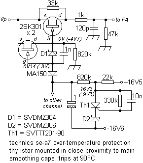 The Technics SE-A7 was a very slim amplifier (just over 2" high) intended to deliver 2 x 60W or 120W in bridge mode. Heat sensors not only monitored the heat-sinks but the main smoothing caps as well. This last was set to trip at 90±5°C.