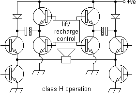 Class H designs switch in a higher voltage supply rail to cope with peaks. The basic arrangement for the Philips TDA1560Q IC, intended for automotive use, is shown below.