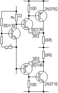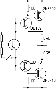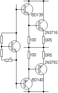 The circuit found strung between the bases of the driver transistors 'ties' them together so that the output does not pass destructive amounts of current. It does, however, allow a little current (quiescent) to flow so that the output devices are biased on. A well-used example is shown below: