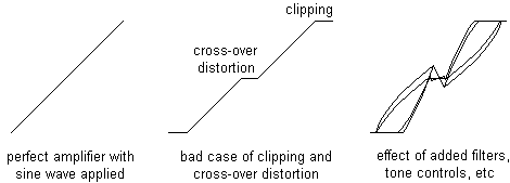 Alternatively, using the input of the amplifier as the x axis, and the output as the y and adjusting the respective amplitudes, a perfectly behaved amplifier will give a straight line at 45°, cross-over distortion appears as a kink in the middle (positive-going for class AB, negative for class B). Adjust the bias setting (R3) for minimum distortion at progressively higher output levels and higher frequencies. Clipping, if desired, and the effects of filters and tone controls can also be displayed, some very interesting results being obtained from some very well-known makes!