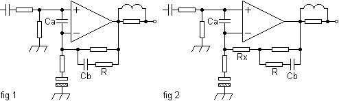 In fig 1, Ca may be included to counteract coupling between the input and output. Both Ca and Cb may not interact on one build but will in another. Reversing the RC network (R-Cb, fig 2) will place R between them reducing the interaction. Alternatively, Rx can be fitted. A small value, say 68R, should suffice.With compact builds the PCB layout can be a cause of instabilities necessitating the use of extra compensation caps to damp oscillation which may only arise at high levels of volume. This can be caused by high magnetic fluxes inducing currents in high impedance low-level areas. As a consequence, keep a distance between the inputs and the output/supply rails. If this is not possible, put a screen between them. Some cases have been seen where an improvement in distortion has been made by running the supply wires (twisted together) perpendicular to the plane of the PCB over a few inches. Instabilities can arise when high current earth wiring follows the same path as that used for low currents.