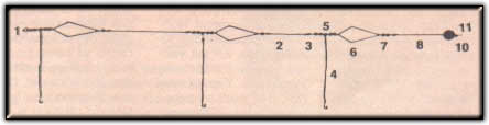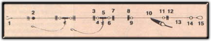 Nudo corredizo; 8. Nudo; 9. Perlita; 10. Boya; 11.