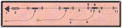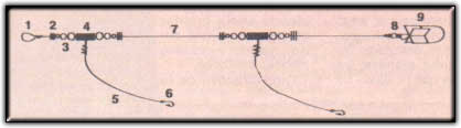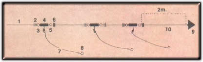 total de la brazolada, 1 m; 3. Anzuelo reten de carnada